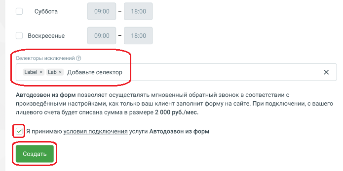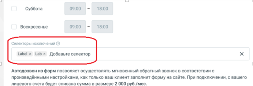 - При настройке формы Автодозвона найдите раздел «Селекторы исключений».