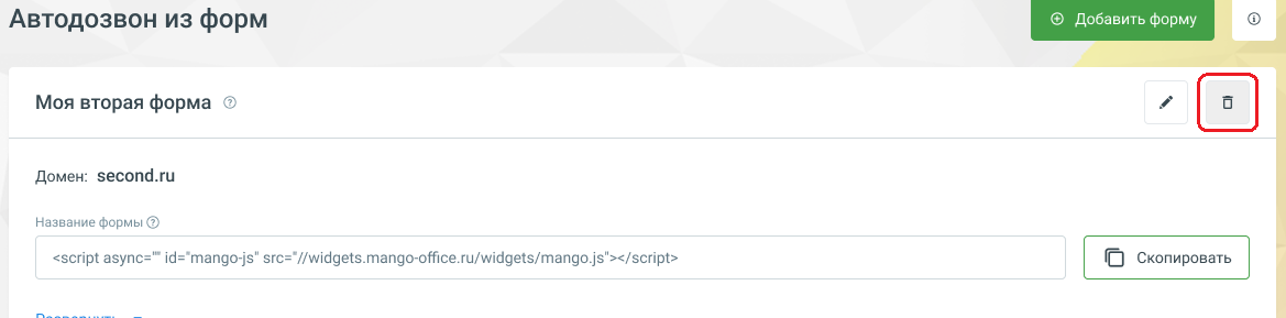 - Для удаления формы — нажмите иконку корзины сверху справа на форме.