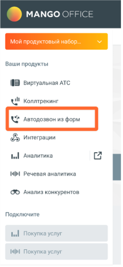 - Найдите услугу в Личном кабинете. В левой панели Личного кабинета найдите строку с наименованием услуги «Автодозвон из форм».
