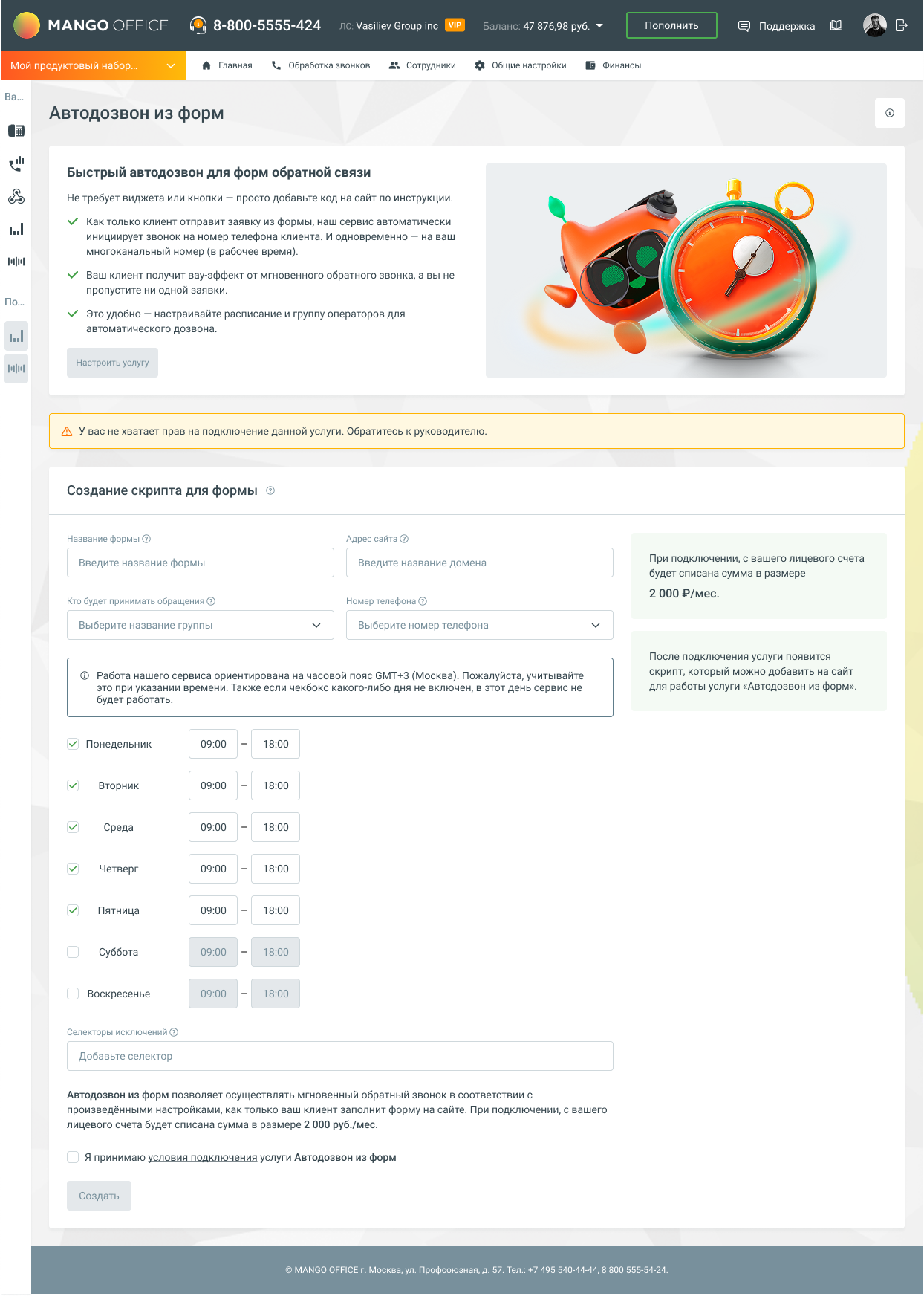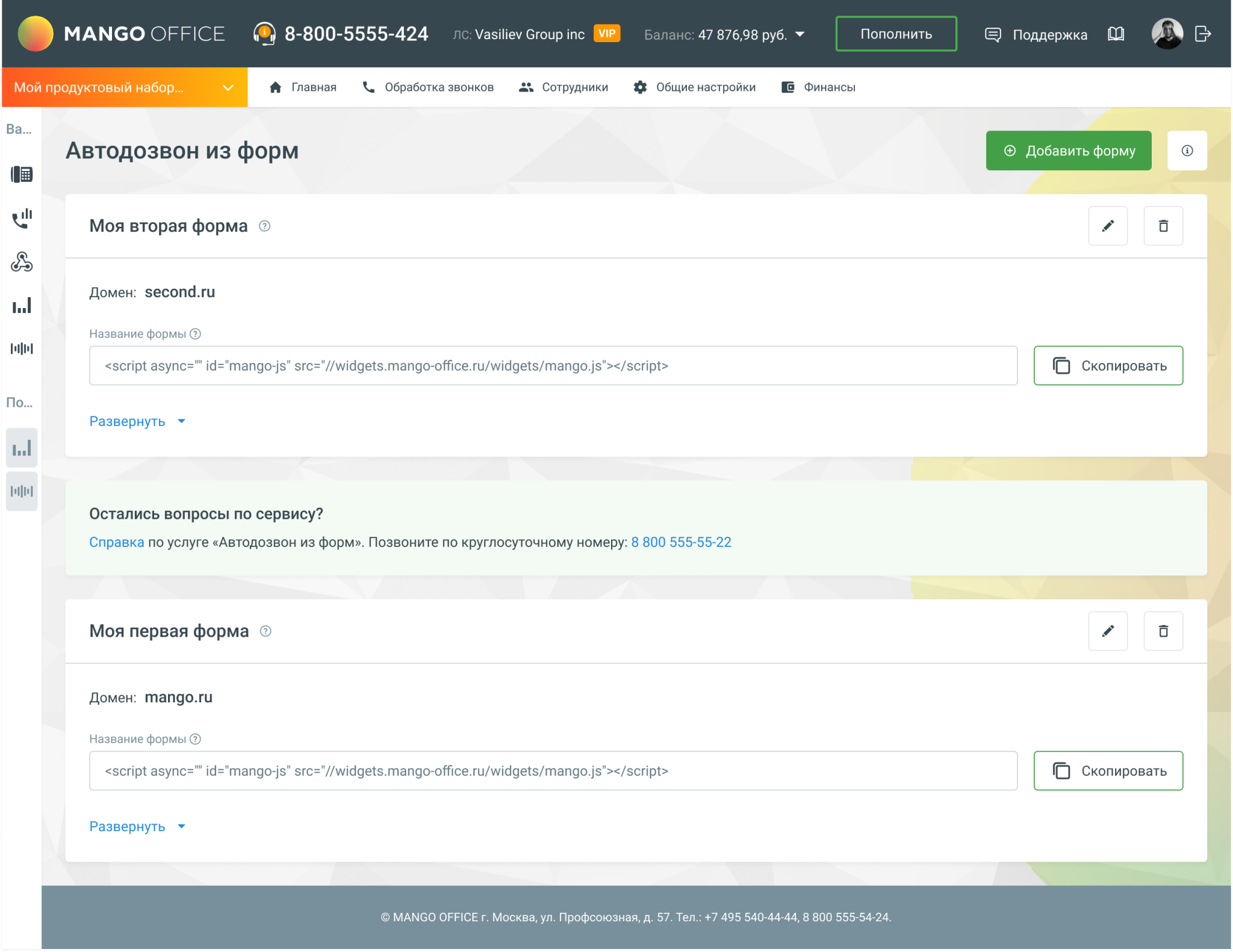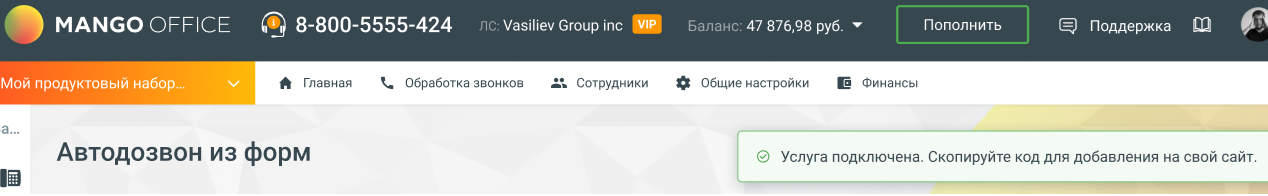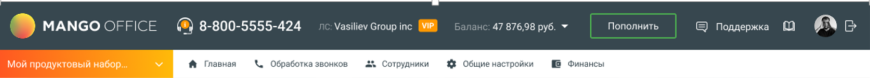 Обязательно подключите Виртуальную АТС (ВАТС) MANGO OFFICE через Личный Кабинет MANGO OFFICE (подробнее).