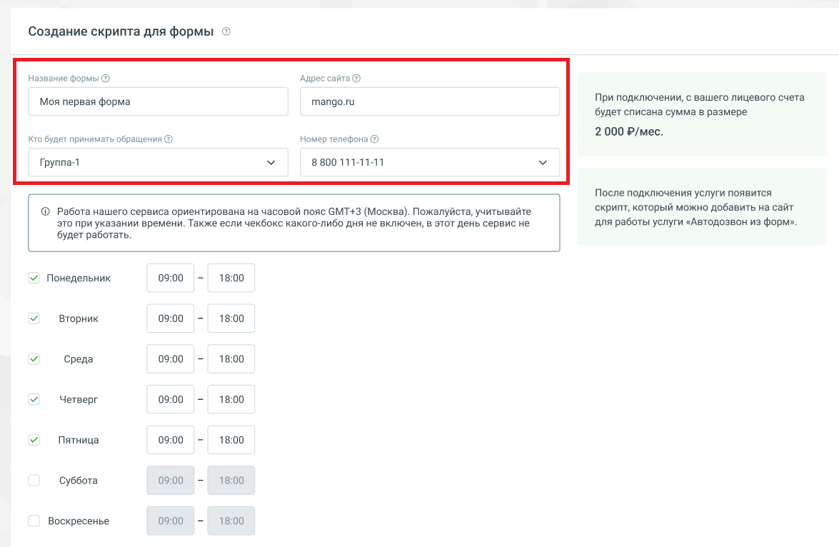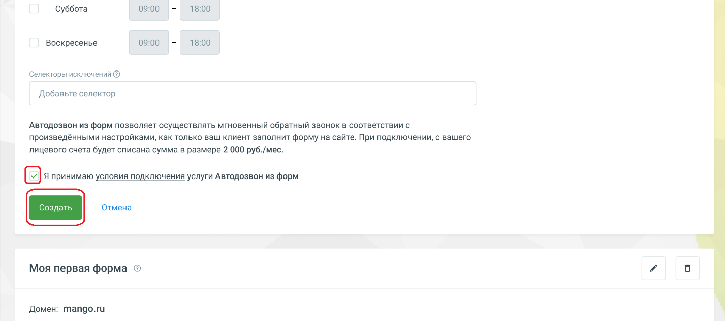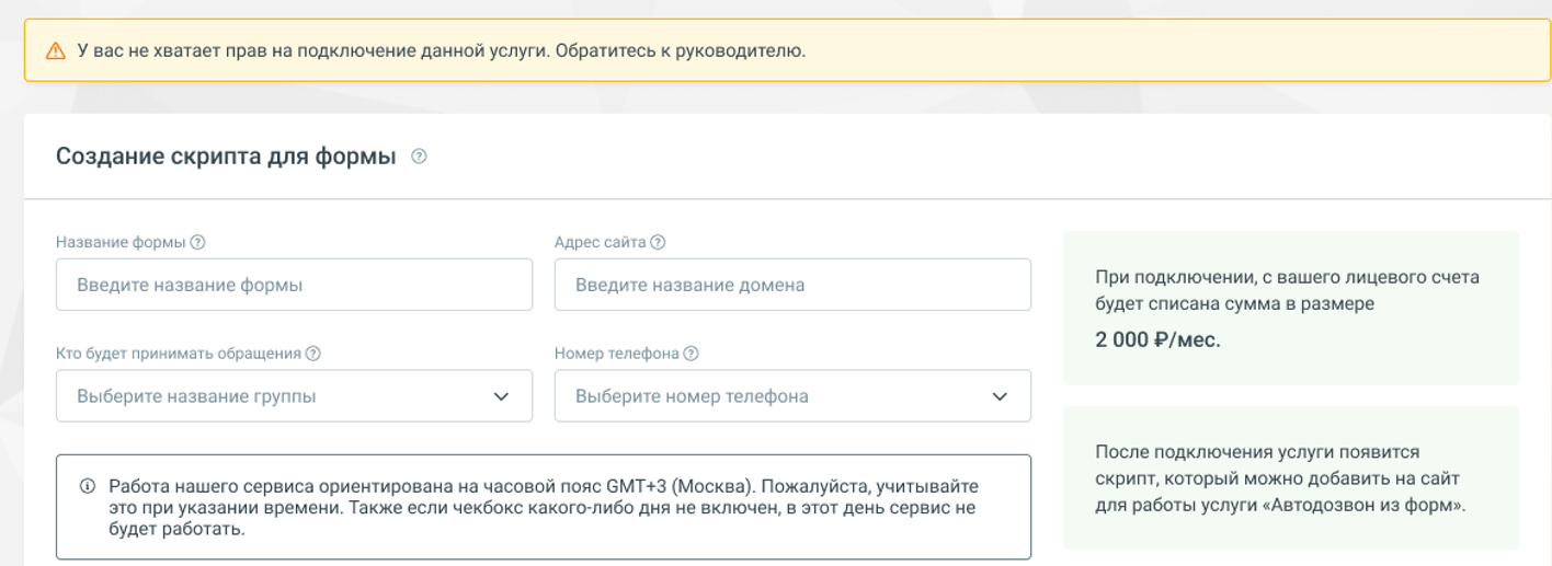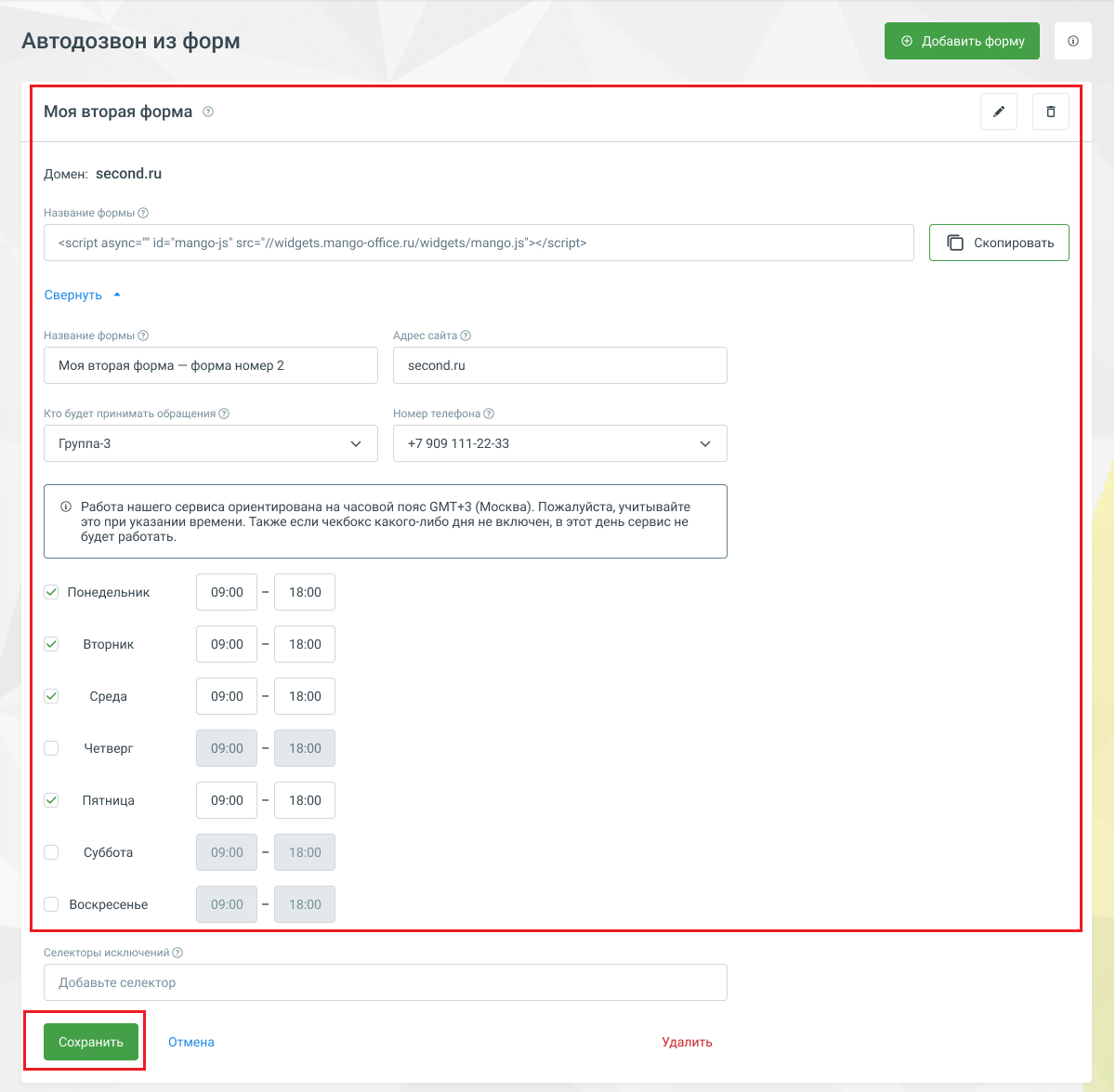 - Возможно для разных страниц настроить несколько услуг «Автодозвон из форм» — например, для направления заявок в разные группы операторов с разным расписанием.