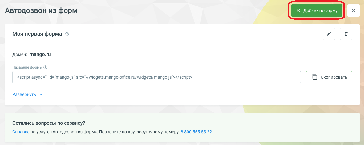 - После нажатия на строку откроется страница услуги «Автодозвон из форм».