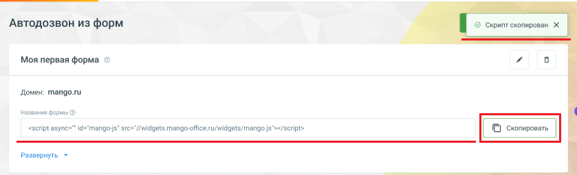 После чего Вы можете скопировать полученный код формы перезвона путем нажатия на соответствующую кнопку и вставить его на Ваш сайт.