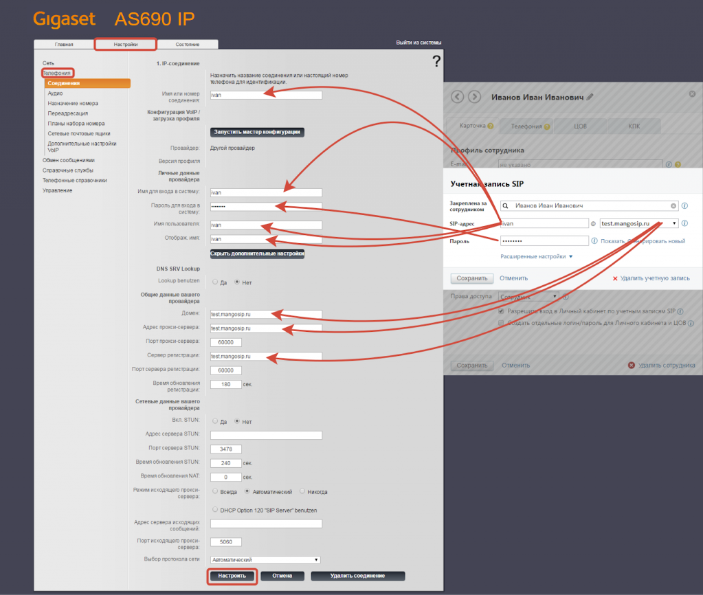 Внимание! В качестве примера на всех скриншотах указан SIP-адрес (имя пользователя и домен) вида ivan@test.mangosip.ru. Вместо него везде необходимо указать ваш SIP-адрес из личного кабинета.
