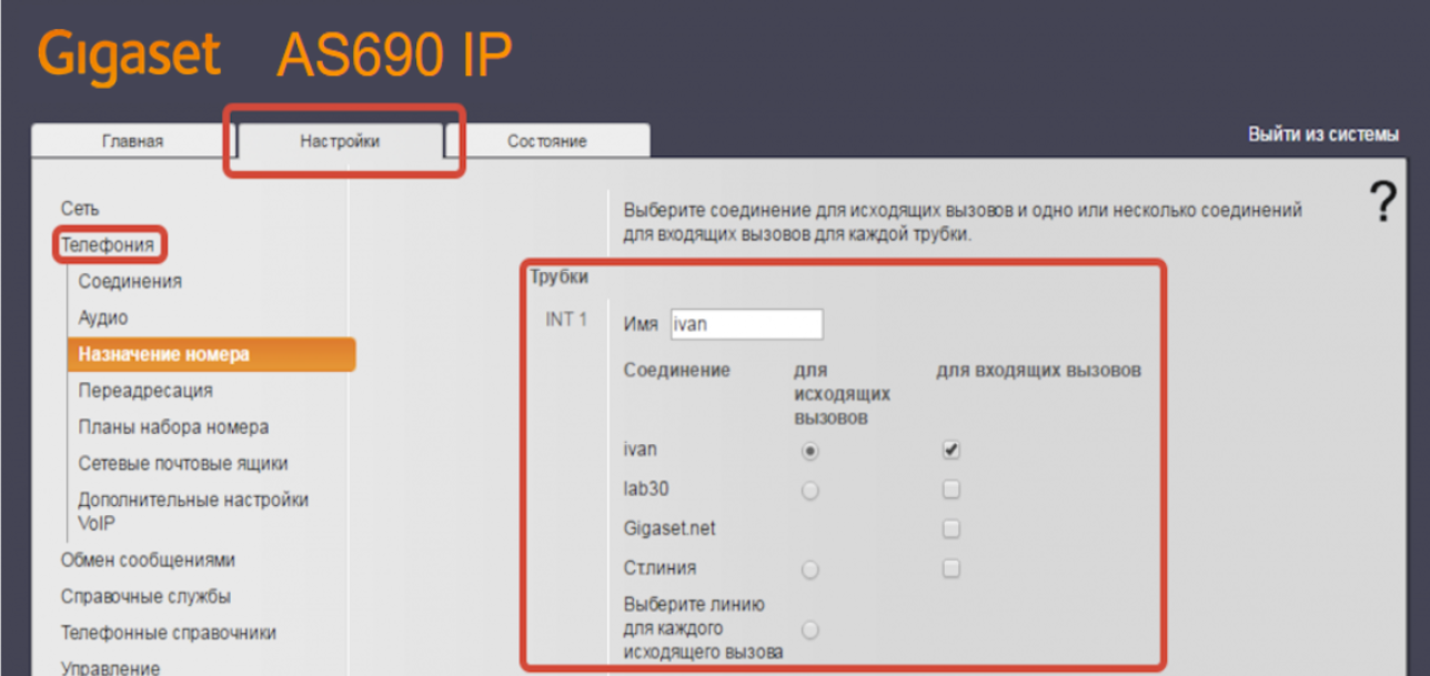 Шаг 4. Слева заходим в подраздел "Назначение номера" и настраиваем, как на скриншоте ниже. (Напротив первой трубки мы указываем, что входящие и исходящие звонки необходимо совершать с помощью настроенного аккаунта ivan)